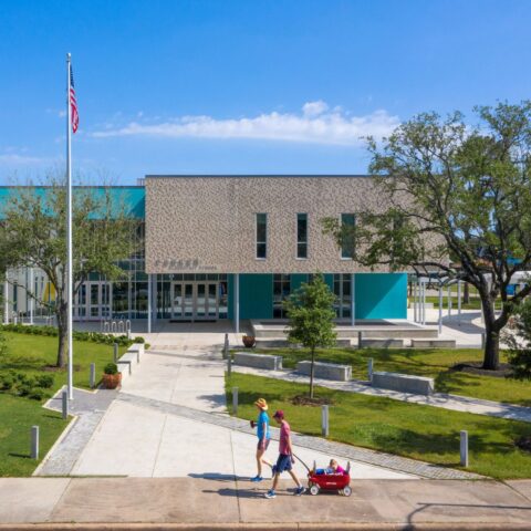 In the Large-Scale Non-Profit Category* the 2025 award went to Cynthia Ann Parker Elementary School. Parker Elementary Schools’s design offers building and site features that incorporate the school’s focus on music and how that is experienced within the community. This new school replaced an existing 50-year-old building while creating a new landmark that provides balance between new and old within the established neighborhood. The 21st-century school design activates hallways to become teaching spaces. Teaching occurs not just within the classrooms and special rooms, but rather throughout the school. The school was placed next to the city park, a large green space to the east for HISD’s new Spark Park, sports field, basketball courts, playgrounds, and walking track to the community. This site planning completed the design by providing a “school within a park.”