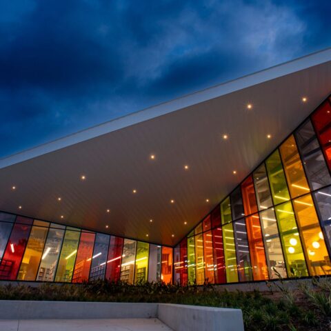 In the Small-Scale Non-Profit Category** the 2025 award went to Dr. Shannon Walker Neighborhood Library. The 23,260 SF next-generation library is a community hub envisioned as a space for the modern community. What was once a forgotten post office site, the library is a vibrant art-filled public gathering space featuring a café, TECHLink with, music, video and podcast recording spaces, flexible meeting areas, private study rooms and a variety of seating arrangements. The layout encourages interaction with nature. Expansive glazing and cavernous walkways allow the patron to engage the building’s internal activities before reaching the entrances. The site cuts deep into the library, allowing patrons multiple spaces in both function and scale to experience nature. Color inhabits these spaces, and sunlight takes a more apparent possession of the building.