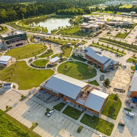 East Aldine Town Center has changed the trajectory for this historically underserved area by setting new expectations for standards of development and creating a destination of essential services including education, social, civic, and economic development. The heart of the campus is the District Building and Town Center Park which incorporates amenities such as play areas, interactive water feature, shade structure, and a performance pavilion for outdoor events with lawn seating. The event lawn is bordered by pathways and a stone-lined water feature that trickles into a rock bed stream at the park’s edge. The stream seems to “disappear” underneath the adjacent drive and flow into a larger feature pond that also serves as a campus-wide stormwater detention basin.