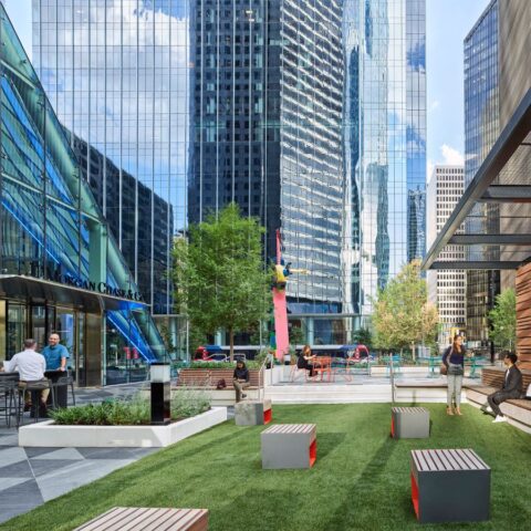 The civic plaza at Houston’s iconic Chase Tower has been transformed into a welcoming park space that integrates the building into the urban fabric of downtown Houston. In a tribute to the building’s iconic history, the plaza and lobby meet at a new glass pyramid entry, a nod to the tower’s original architect, I.M. Pei. The renovation weaves together interior and exterior amenities to enhance the the experience of downtown workers and residents while also creating a landmark within Downtown Houston’s public realm. Infusing the space with new energy and attracting world-class tenants, the design transforms the underutilized plaza into a vibrant urban garden that optimizes its premiere location and proximity to the historic, cultural, and transit offerings of downtown.
